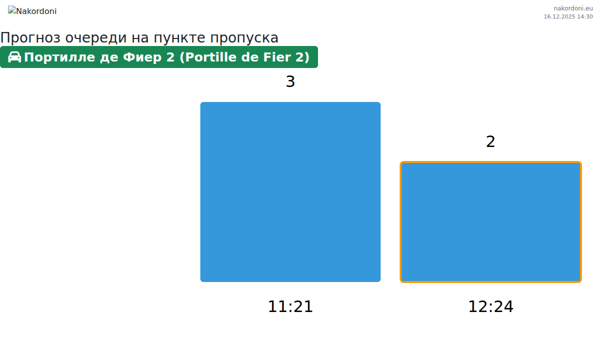 Планируйте свои поездки заранее, используя актуальную информацию о очередях на границе на пункте пропуска Портилле де Фиер 2 (Portille de Fier 2) - легковой автомобиль, чтобы сделать ваш переход быстрым и удобным. Обратите особое внимание на эти часы, чтобы избежать пиковых нагрузок и сократить время ожидания.