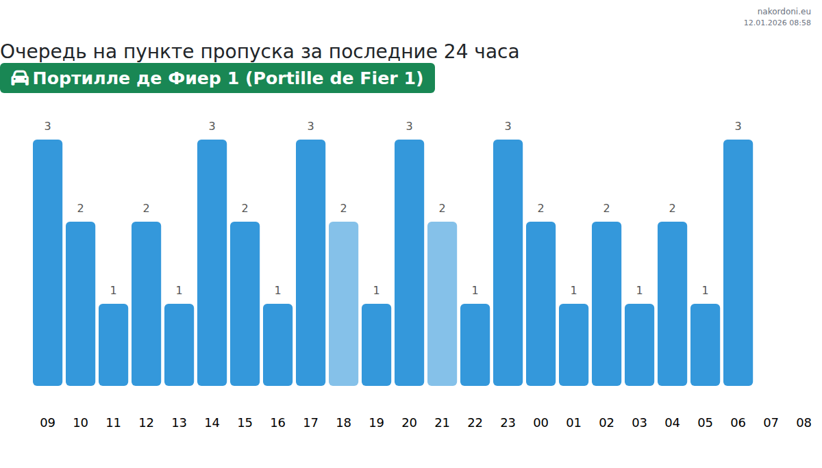 Чтобы избежать длинных очередей на границе на пункте пропуска Портилле де Фиер 1 (Portille de Fier 1) - легковой автомобиль, рекомендуем планировать пересечение границы в часы наименьшей нагрузки. Согласно данным за прошлые сутки, наименьшее количество автомобилей наблюдалось между 1:00 и 4:00 часами. Это идеальное время для пересечения границы, чтобы сэкономить время и избежать задержек.