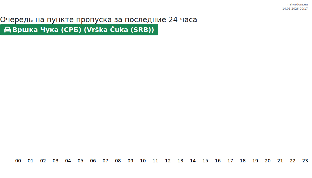 Планируйте свои поездки заранее, используя актуальную информацию о очередях на границе на пункте пропуска Вршка Чука (СРБ) (Vrška Čuka (SRB)) - легковой автомобиль, чтобы сделать ваш переход быстрым и удобным. Обратите особое внимание на эти часы, чтобы избежать пиковых нагрузок и сократить время ожидания.