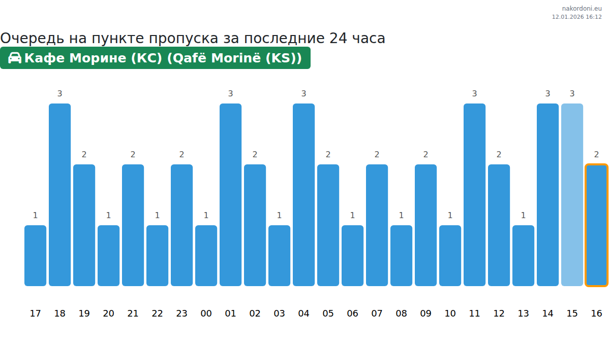 Планируйте свои поездки заранее, используя актуальную информацию о очередях на границе на пункте пропуска Кафе Морине (КС) (Qafë Morinë (KS)) - легковой автомобиль, чтобы сделать ваш переход быстрым и удобным. Обратите особое внимание на эти часы, чтобы избежать пиковых нагрузок и сократить время ожидания.