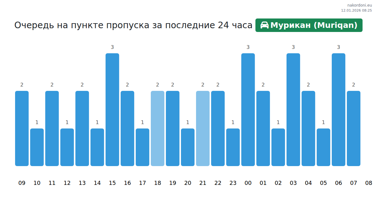 Чтобы избежать длинных очередей на границе на пункте пропуска Мурикан (Muriqan) - легковой автомобиль, рекомендуем планировать пересечение границы в часы наименьшей нагрузки. Согласно данным за прошлые сутки, наименьшее количество автомобилей наблюдалось между 1:00 и 3:00 часами. Это идеальное время для пересечения границы, чтобы сэкономить время и избежать задержек.