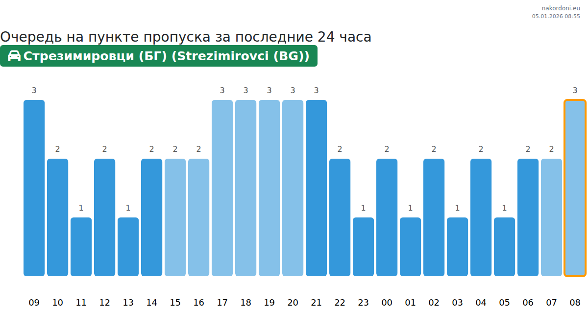 Планируйте свои поездки заранее, используя актуальную информацию о очередях на границе на пункте пропуска Стрезимировци (БГ) (Strezimirovci (BG)) - легковой автомобиль, чтобы сделать ваш переход быстрым и удобным. Обратите особое внимание на эти часы, чтобы избежать пиковых нагрузок и сократить время ожидания.