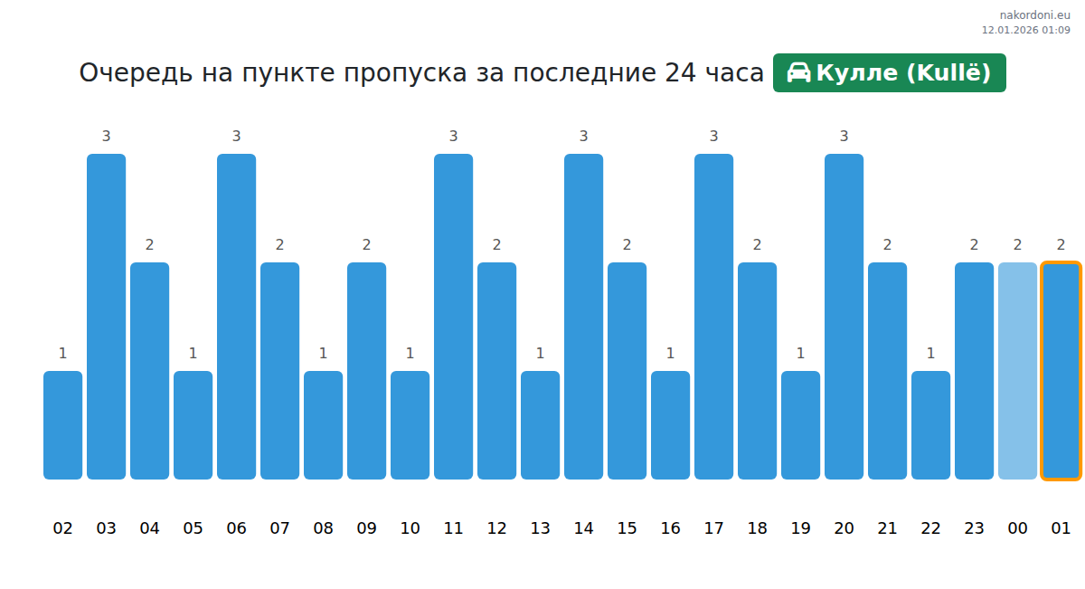 Чтобы избежать длинных очередей на границе на пункте пропуска Кулле (Kullë) - легковой автомобиль, рекомендуем планировать пересечение границы в часы наименьшей нагрузки. Согласно данным за прошлые сутки, наименьшее количество автомобилей наблюдалось между 3:00 и 6:00 часами. Это идеальное время для пересечения границы, чтобы сэкономить время и избежать задержек.