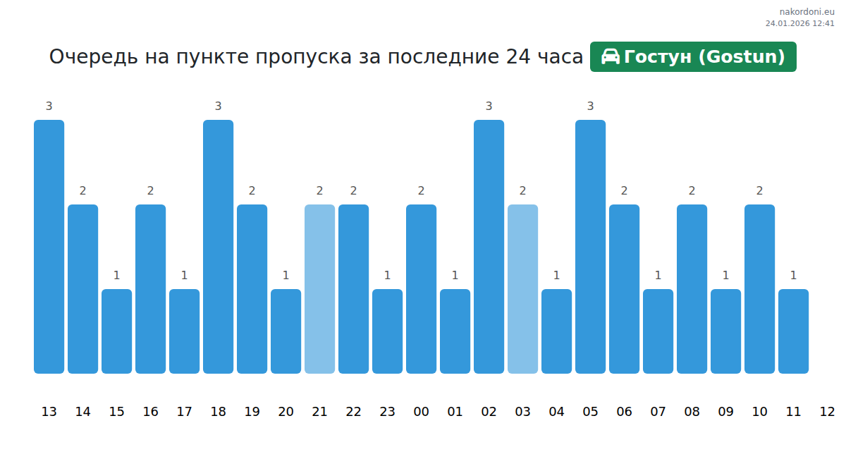 Планируйте свои поездки заранее, используя актуальную информацию о очередях на границе на пункте пропуска Гостун (Gostun) - легковой автомобиль, чтобы сделать ваш переход быстрым и удобным. Обратите особое внимание на эти часы, чтобы избежать пиковых нагрузок и сократить время ожидания.