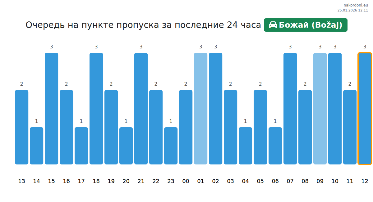 Планируйте свои поездки заранее, используя актуальную информацию о очередях на границе на пункте пропуска Божай (Božaj) - легковой автомобиль, чтобы сделать ваш переход быстрым и удобным. Обратите особое внимание на эти часы, чтобы избежать пиковых нагрузок и сократить время ожидания.