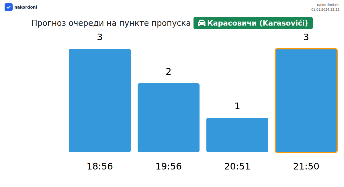 Чтобы избежать длинных очередей на границе на пункте пропуска Карасовичи (Karasovići) - легковой автомобиль, рекомендуем планировать пересечение границы в часы наименьшей нагрузки. Согласно данным за прошлые сутки, наименьшее количество автомобилей наблюдалось между 1:00 и 4:00 часами. Это идеальное время для пересечения границы, чтобы сэкономить время и избежать задержек.
