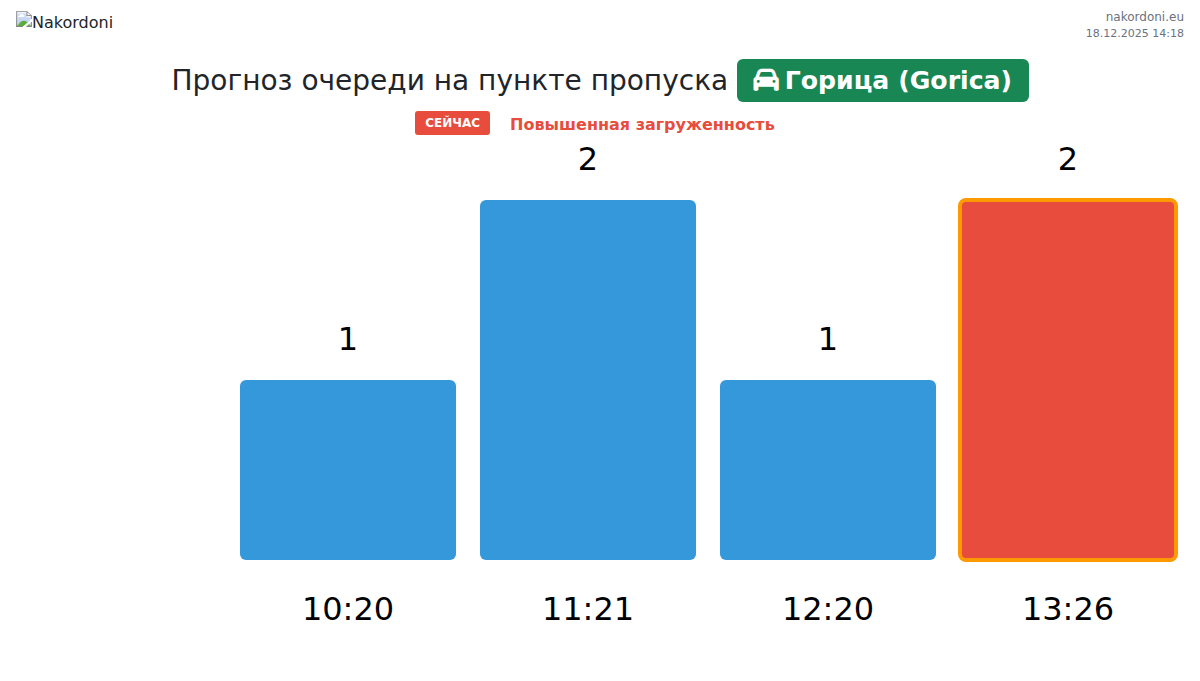 Планируйте свои поездки заранее, используя актуальную информацию о очередях на границе на пункте пропуска Горица (Gorica) - легковой автомобиль, чтобы сделать ваш переход быстрым и удобным. Обратите особое внимание на эти часы, чтобы избежать пиковых нагрузок и сократить время ожидания.