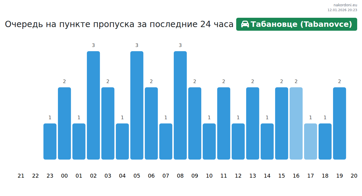 Планируйте свои поездки заранее, используя актуальную информацию о очередях на границе на пункте пропуска Табановце (Tabanovce) - легковой автомобиль, чтобы сделать ваш переход быстрым и удобным. Обратите особое внимание на эти часы, чтобы избежать пиковых нагрузок и сократить время ожидания.