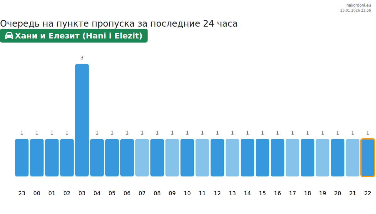 Чтобы избежать длинных очередей на границе на пункте пропуска Хани и Елезит (Hani i Elezit) - легковой автомобиль, рекомендуем планировать пересечение границы в часы наименьшей нагрузки. Согласно данным за прошлые сутки, наименьшее количество автомобилей наблюдалось между :00 и 2:00 часами. Это идеальное время для пересечения границы, чтобы сэкономить время и избежать задержек.