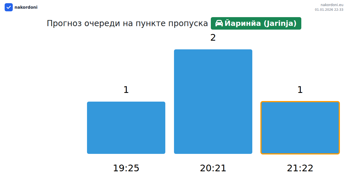Планируйте свои поездки заранее, используя актуальную информацию о очередях на границе на пункте пропуска Йаринйа (Jarinja) - легковой автомобиль, чтобы сделать ваш переход быстрым и удобным. Обратите особое внимание на эти часы, чтобы избежать пиковых нагрузок и сократить время ожидания.