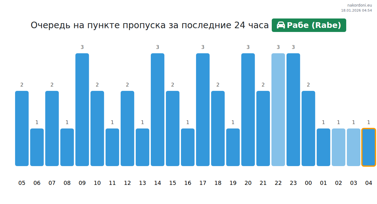 Чтобы избежать длинных очередей на границе на пункте пропуска Рабе (Rabe) - легковой автомобиль, рекомендуем планировать пересечение границы в часы наименьшей нагрузки. Согласно данным за прошлые сутки, наименьшее количество автомобилей наблюдалось между 1:00 и 4:00 часами. Это идеальное время для пересечения границы, чтобы сэкономить время и избежать задержек.