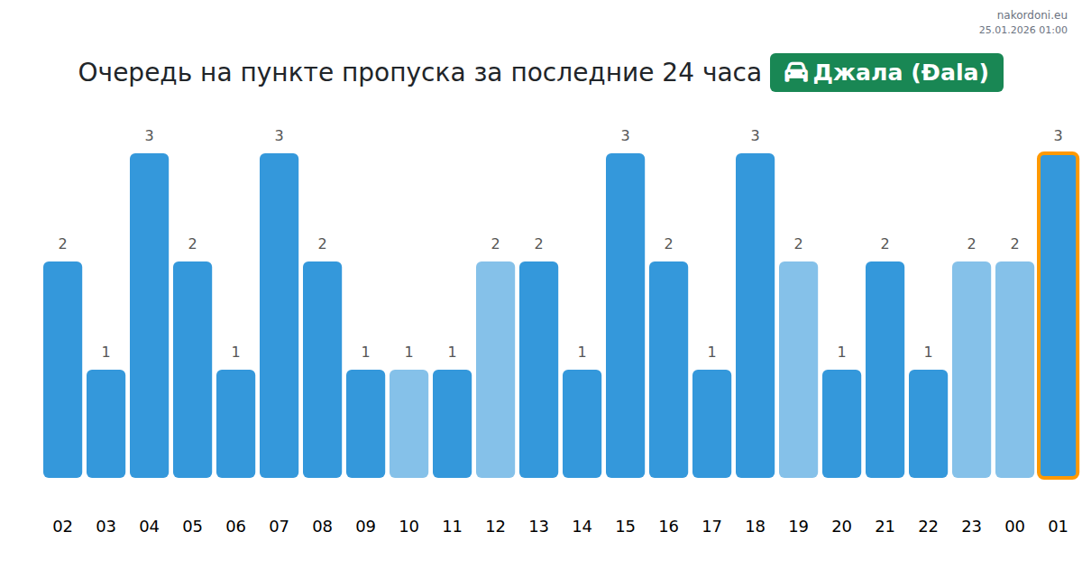 Чтобы избежать длинных очередей на границе на пункте пропуска Джала (Đala) - легковой автомобиль, рекомендуем планировать пересечение границы в часы наименьшей нагрузки. Согласно данным за прошлые сутки, наименьшее количество автомобилей наблюдалось между :00 и 3:00 часами. Это идеальное время для пересечения границы, чтобы сэкономить время и избежать задержек.