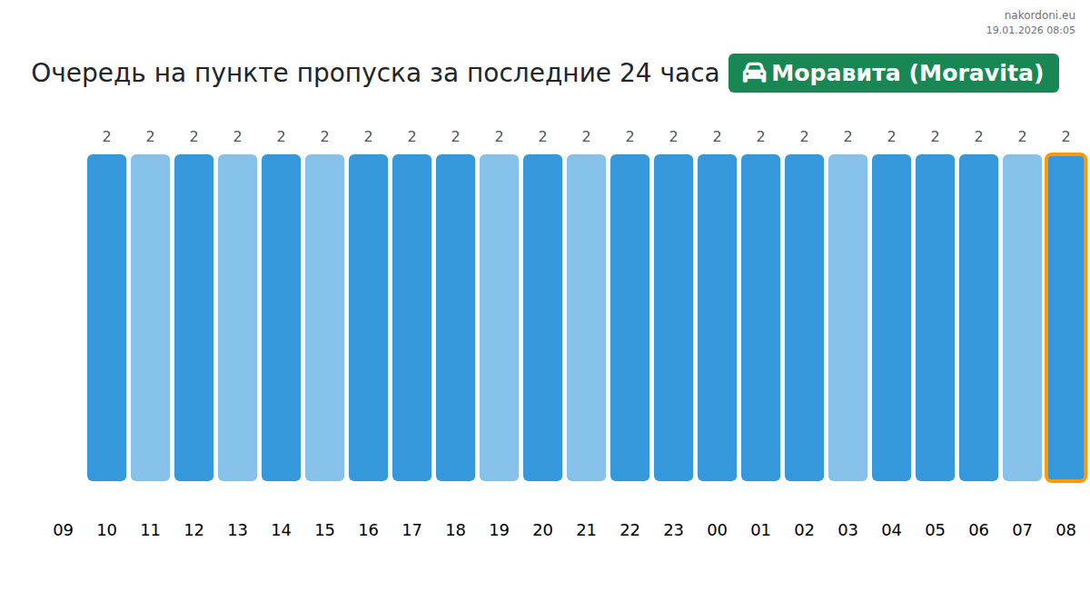 Планируйте свои поездки заранее, используя актуальную информацию о очередях на границе на пункте пропуска Моравита (Moravita) - легковой автомобиль, чтобы сделать ваш переход быстрым и удобным. Обратите особое внимание на эти часы, чтобы избежать пиковых нагрузок и сократить время ожидания.