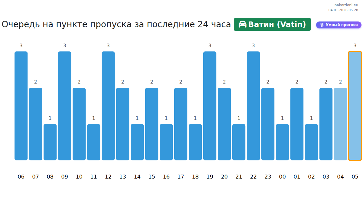 Планируйте свои поездки заранее, используя актуальную информацию о очередях на границе на пункте пропуска Ватин (Vatin) - легковой автомобиль, чтобы сделать ваш переход быстрым и удобным. Обратите особое внимание на эти часы, чтобы избежать пиковых нагрузок и сократить время ожидания.
