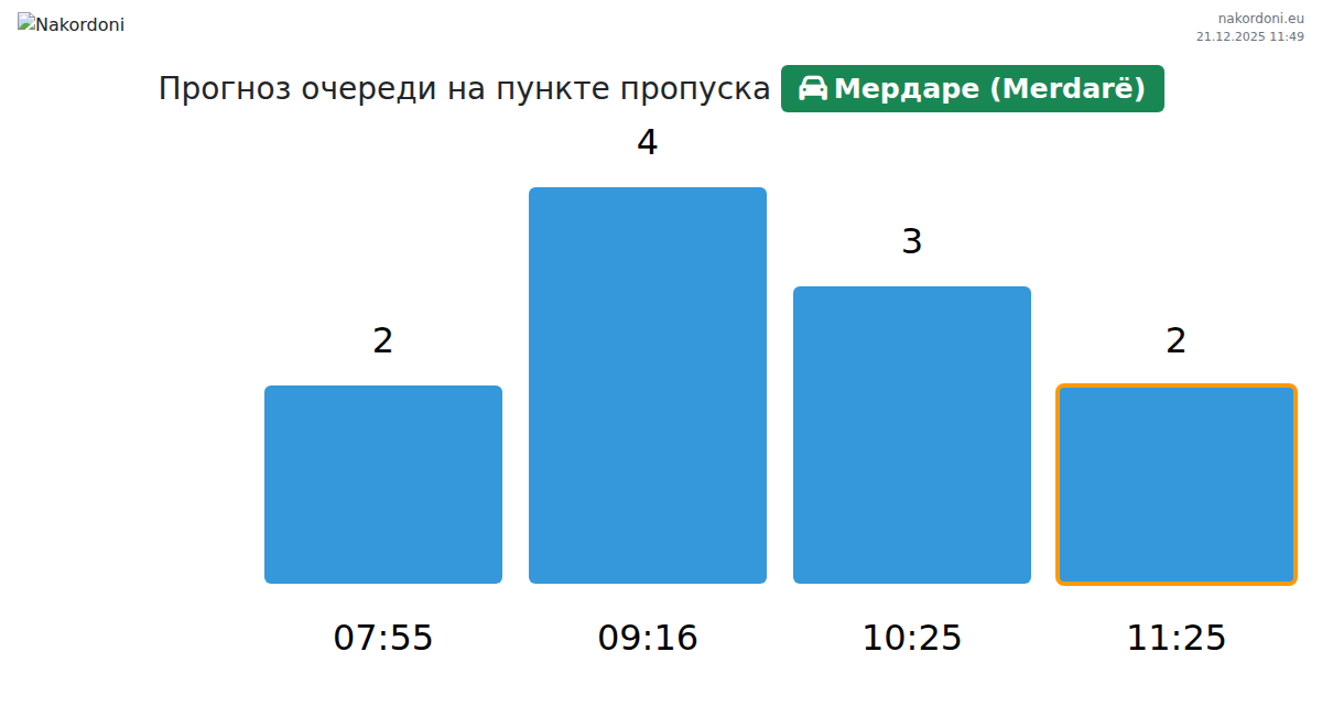 Планируйте свои поездки заранее, используя актуальную информацию о очередях на границе на пункте пропуска Мердаре (Merdarë) - легковой автомобиль, чтобы сделать ваш переход быстрым и удобным. Обратите особое внимание на эти часы, чтобы избежать пиковых нагрузок и сократить время ожидания.