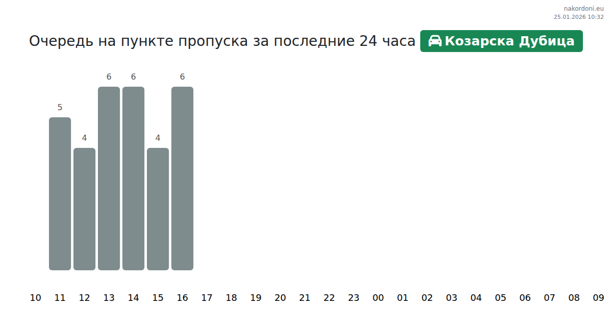Планируйте свои поездки заранее, используя актуальную информацию о очередях на границе на пункте пропуска Козарска Дубица - легковой автомобиль, чтобы сделать ваш переход быстрым и удобным. Обратите особое внимание на эти часы, чтобы избежать пиковых нагрузок и сократить время ожидания.
