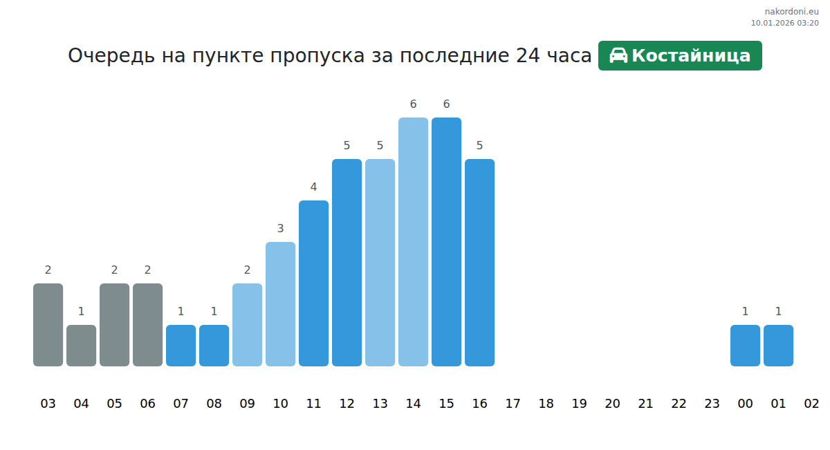 Планируйте свои поездки заранее, используя актуальную информацию о очередях на границе на пункте пропуска Костайница - легковой автомобиль, чтобы сделать ваш переход быстрым и удобным. Обратите особое внимание на эти часы, чтобы избежать пиковых нагрузок и сократить время ожидания.