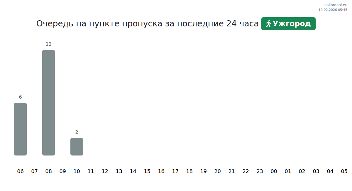 На пункте пропуска Ужгород прогнозируемое время ожидания для транспортных средств составляет 15-108 минут, в среднем 29 минут. Чтобы избежать длинных очередей, лучше обходить пиковые часы в 20:00, 14:00 и 13:00. Кратчайшее время ожидания ожидается в 01:00, 02:00 и 03:00.