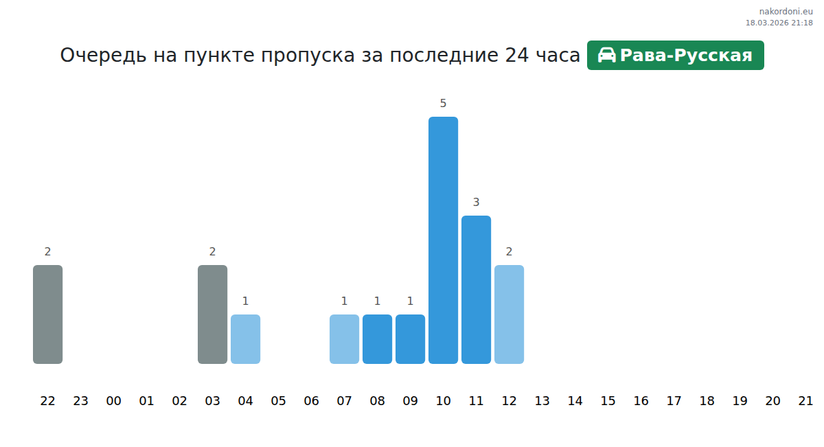 На пункте пропуска Рава-Русская ожидайте время ожидания 15-75 минут для легковых автомобилей. Рекомендуем избегать пиковых часов: 16:00, 11:00 и 17:00. Для кратчайших очередей пересекайте границу в 15:00, 18:00 или 21:00.