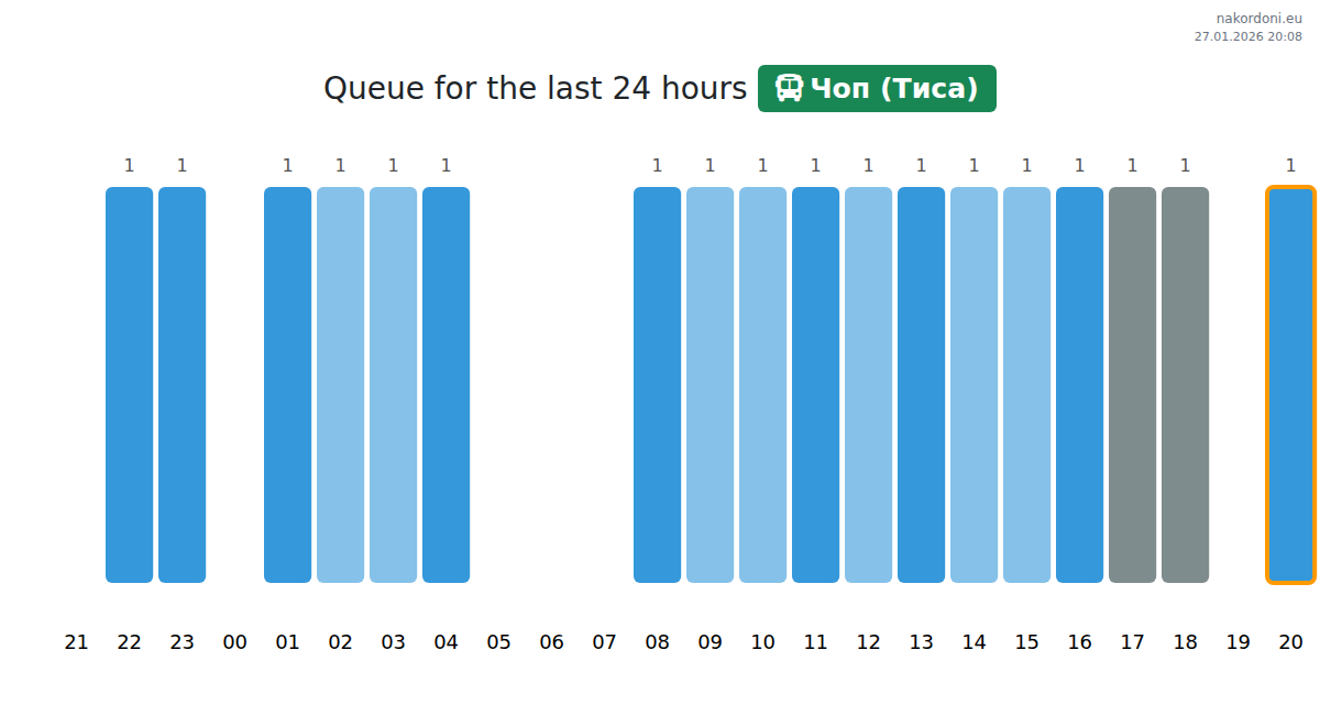 Планирајте своја путовања унапред користећи актуелне информације о редовима на граници на прелазу Чоп (Тиса) - аутобус, за брз и удобан прелазак. Обратите посебну пажњу на ове сате да бисте избегли шпицеве и смањили време чекања.
