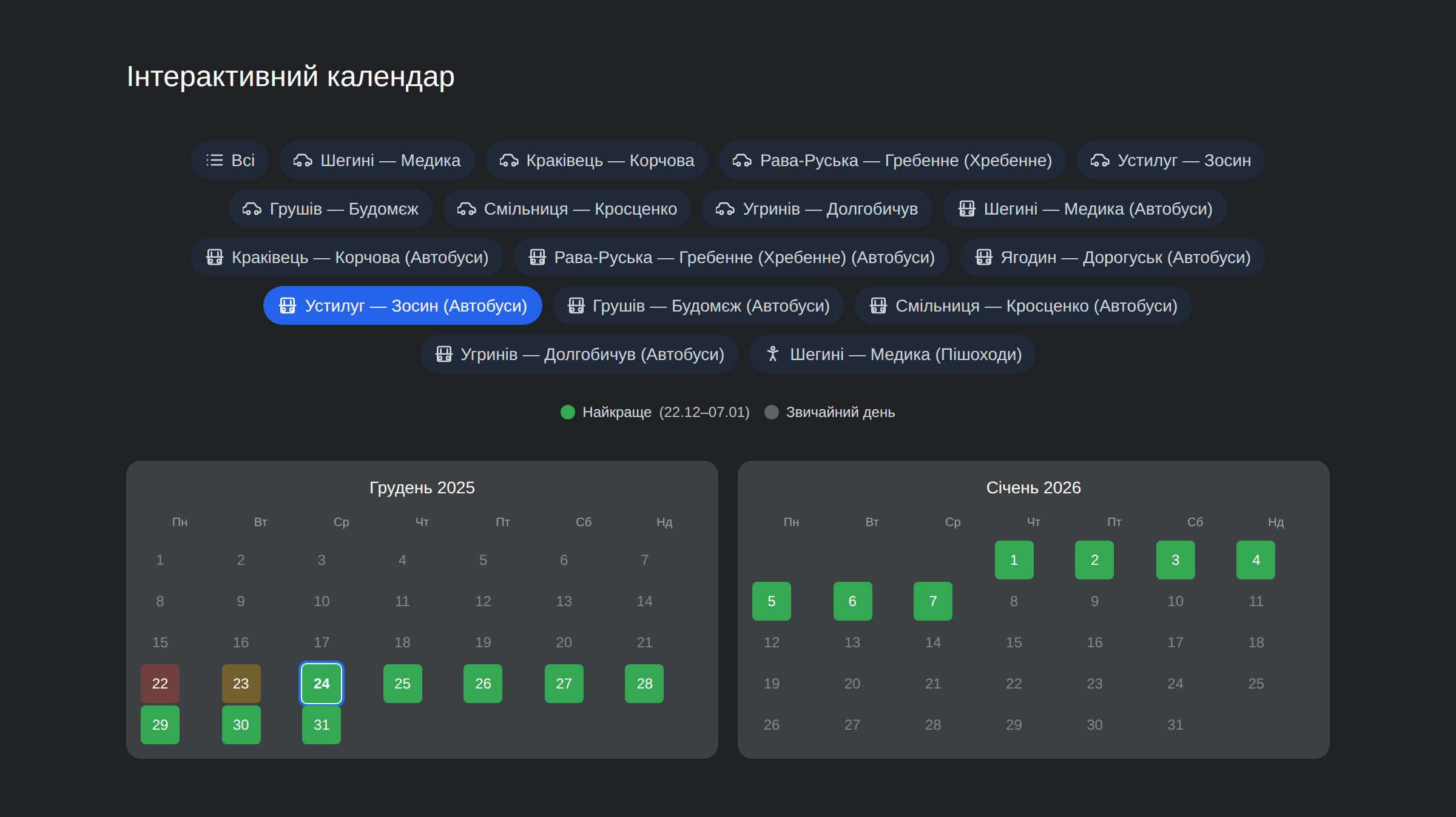 Уникайте цих днів: 6, 7, 22, 23, 24, 25, 31 (очікування до 420+ хв). Це пікові дні — Святвечір, Новий рік. Якщо можливо, перенесіть поїздку.