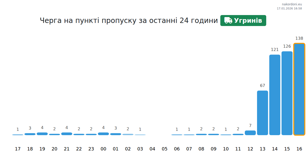 За період 16.01.2026 з 00:00 по 23:59 на кордоні на пункті пропуску Угринів - вантажний транспорт були зафіксовані наступні ключові моменти: