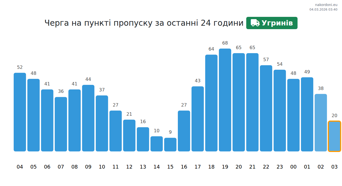 На Угринові час очікування коливається від 15 до 5295 хвилин. Уникайте перетину з 22:00, 00:00, 01:00 через пікове навантаження. Найкращі години для швидкого проїзду: 02:00, 03:00, 04:00.
