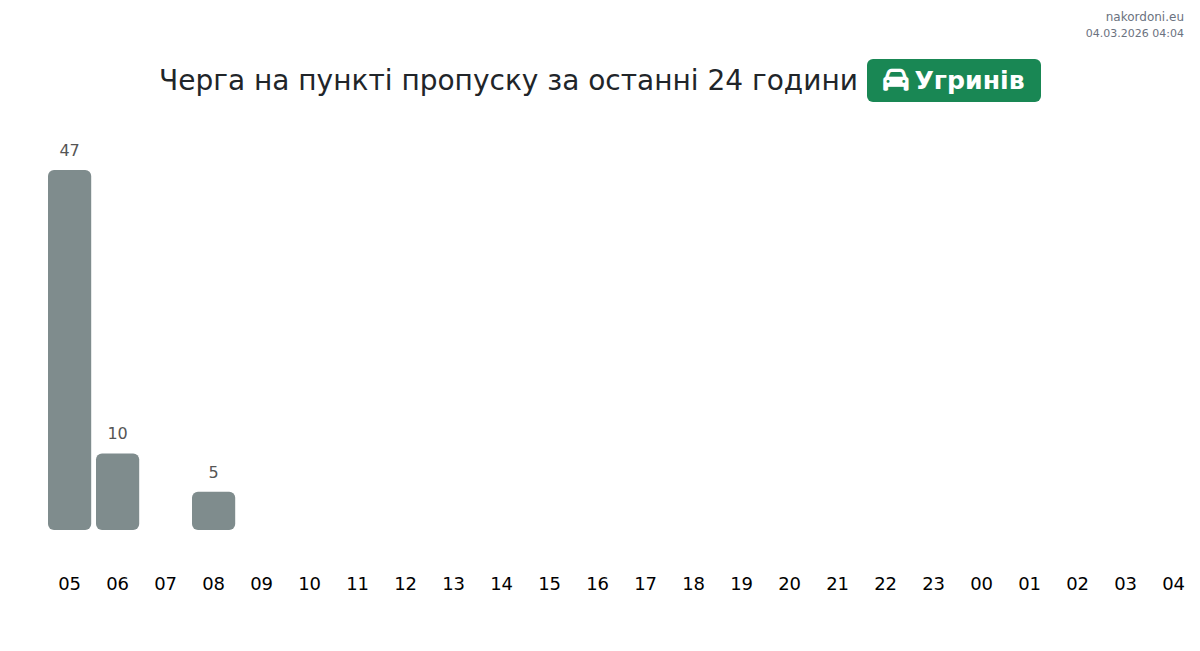 На пункті пропуску Угринів час очікування для легкових авто становить від 15 до 2135 хвилин. Рекомендуємо уникати пікових годин (14:00, 03:00, 01:00), щоб не стояти в черзі. Найкращий час для перетину — 02:00, 05:00 та 07:00, коли затримки мінімальні.