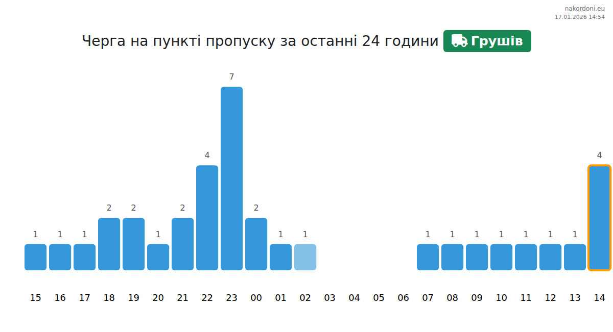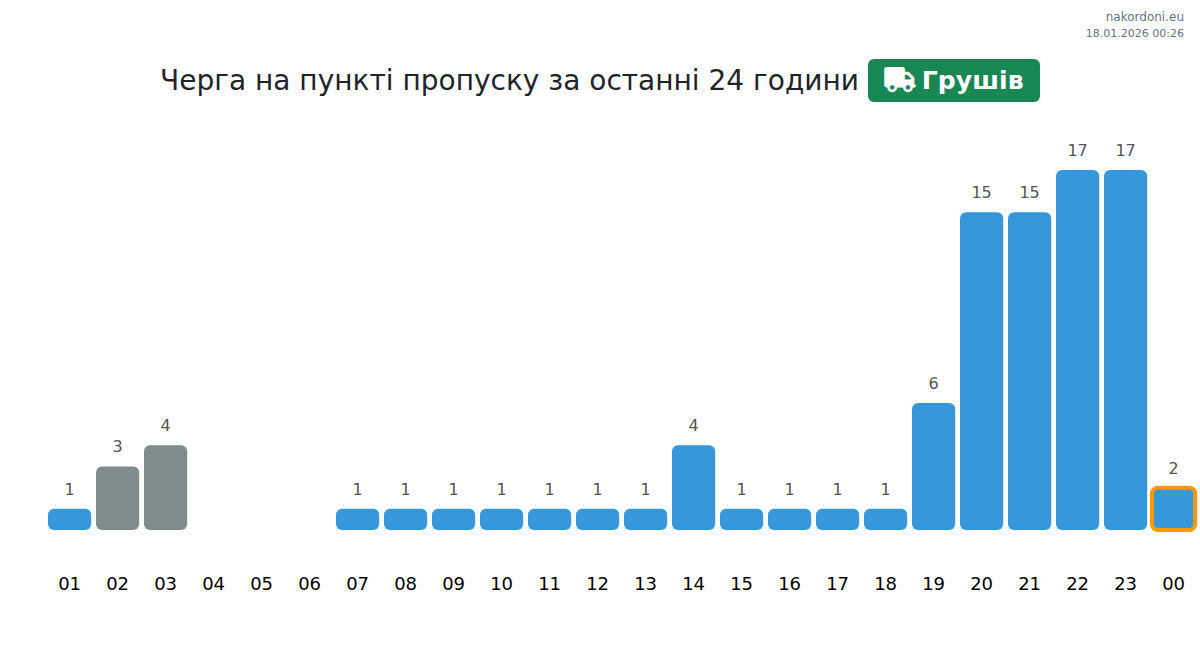 За період 16.01.2026 з 00:00 по 23:59 на кордоні на пункті пропуску Грушів - вантажний транспорт (до 7,5 тонн) були зафіксовані наступні ключові моменти: