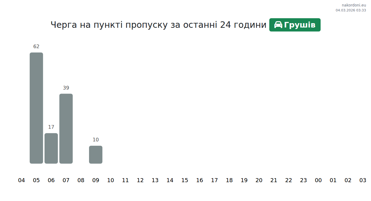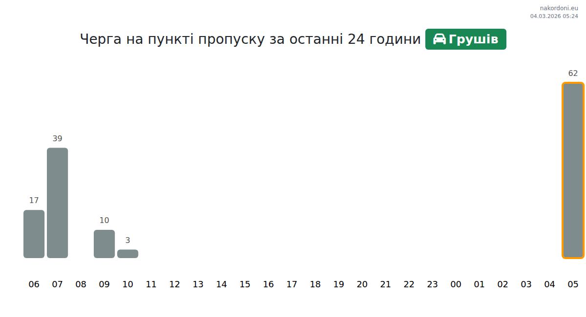У пункті Грушів очікується значна мінливість, час очікування може становити від 15 до 3535 хвилин. Щоб уникнути затримок, уникайте пікових годин близько 05:00, 03:00 та 01:00. Найкращий час для перетину — 00:00, 02:00 та 06:00.