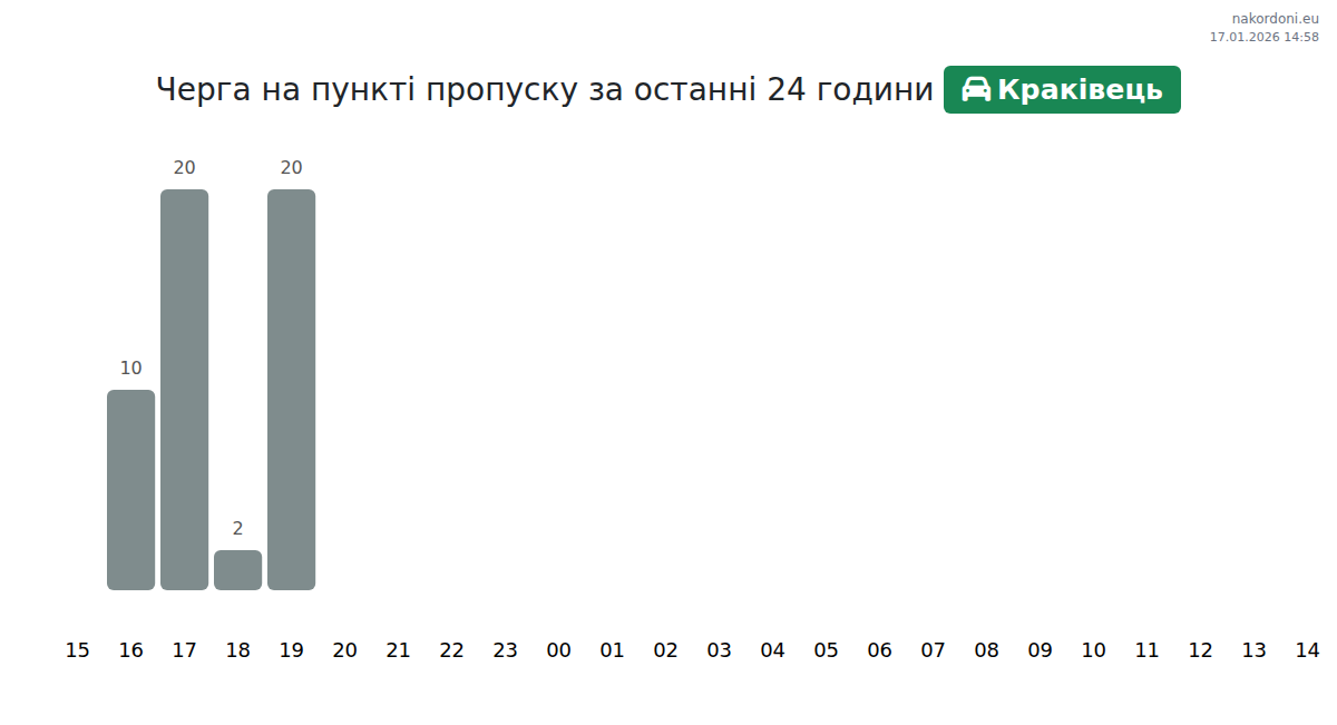На КПП Краківець очікування для легкових авто становить 15-1015 хв. Найбільші черги прогнозуються о 12:00, 18:00 та 23:00. Найкращий час для швидкого перетину кордону: 22:00, 00:00 та 01:00.