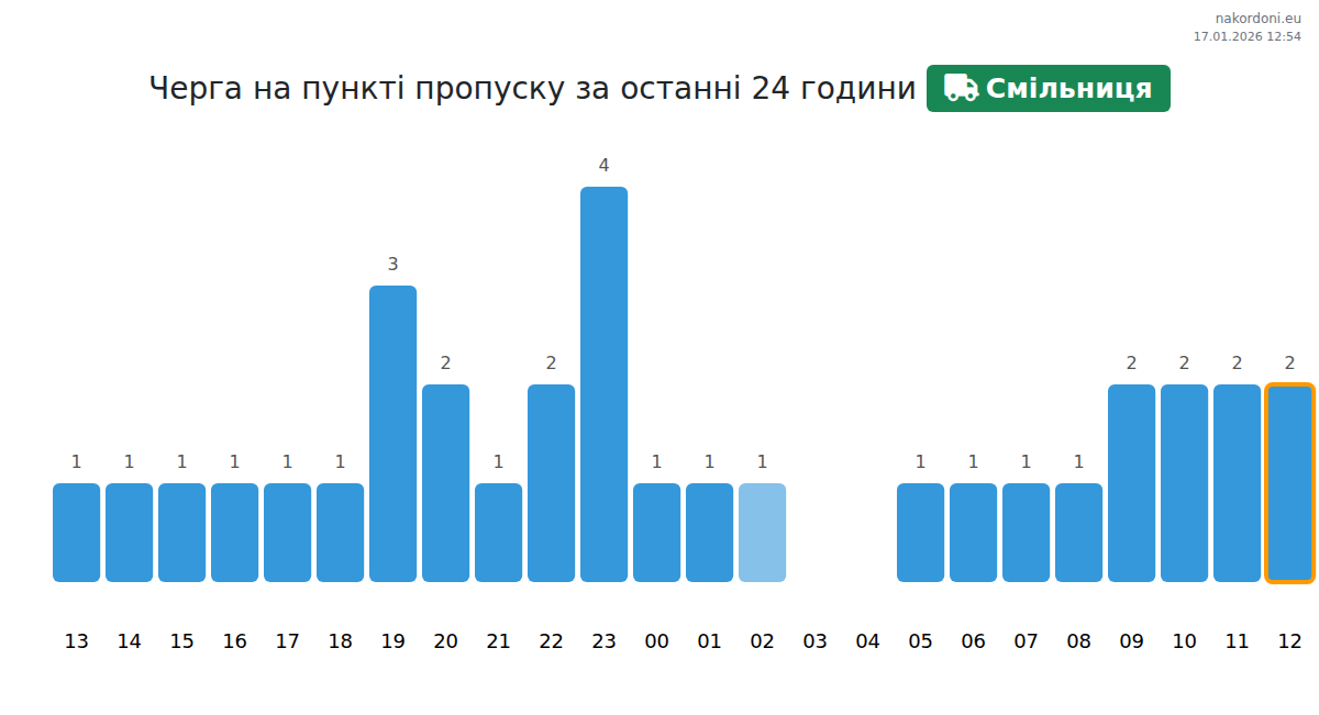 Для уникнення довгих черг на кордоні на пункті пропуску Смільниця - вантажний транспорт (до 7,5 тонн), рекомендуємо планувати перетин кордону в години найменшого навантаження. Згідно з даними за минулу добу, найменша кількість автомобілів спостерігалася між :00 та 1:00 годинами. Це ідеальний час для перетину кордону, щоб зекономити час і уникнути затримок.