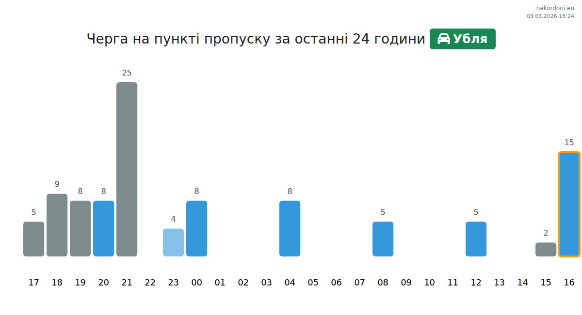 На пункті Убля очікується час очікування від 15 до 75 хвилин для легкових автомобілів. Найбільш завантажені години: 10:00, 20:00 та 06:00. Для менших черг рекомендуємо перетинати кордон о 19:00, 21:00 або 22:00.