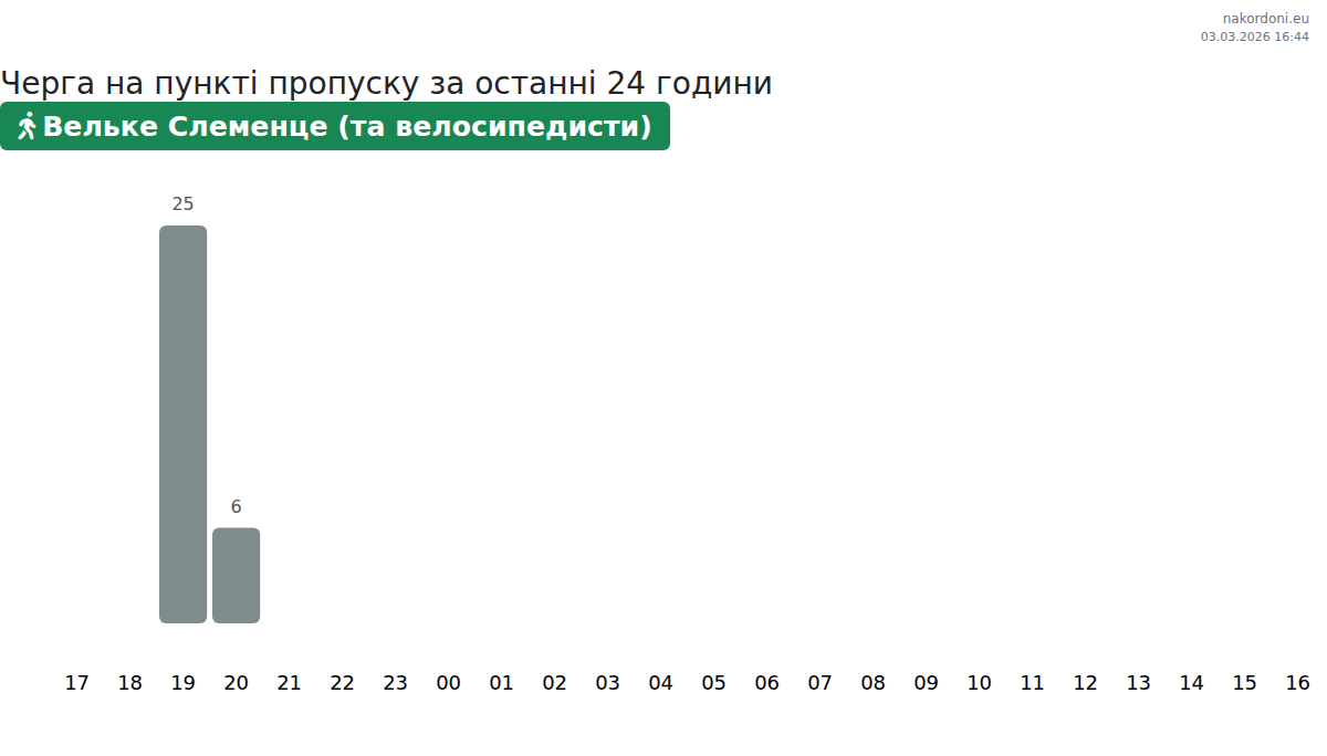 Для уникнення довгих черг на кордоні на пункті пропуску Вельке Слеменце (та велосипедисти) - пішохід, рекомендуємо планувати перетин кордону в години найменшого навантаження. Згідно з даними за минулу добу, найменша кількість автомобілів спостерігалася між 8:00 та 12:00 годинами. Це ідеальний час для перетину кордону, щоб зекономити час і уникнути затримок.