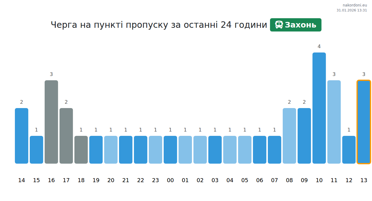 Для уникнення довгих черг на кордоні на пункті пропуску Захонь - автобус, рекомендуємо планувати перетин кордону в години найменшого навантаження. Згідно з даними за минулу добу, найменша кількість автомобілів спостерігалася між :00 та 3:00 годинами. Це ідеальний час для перетину кордону, щоб зекономити час і уникнути затримок.