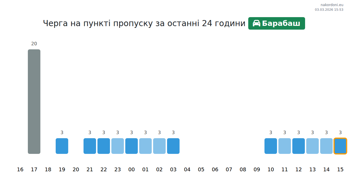 Для уникнення довгих черг на кордоні на пункті пропуску Барабаш - легковий автомобіль, рекомендуємо планувати перетин кордону в години найменшого навантаження. Згідно з даними за минулу добу, найменша кількість автомобілів спостерігалася між 1:00 та 4:00 годинами. Це ідеальний час для перетину кордону, щоб зекономити час і уникнути затримок.