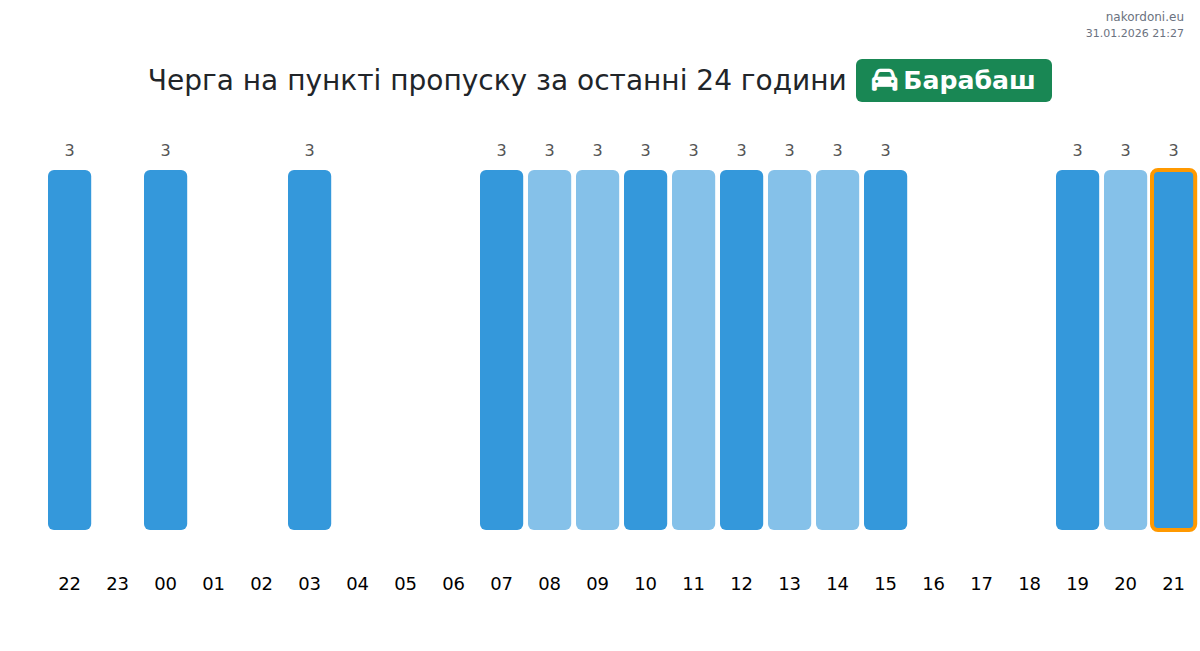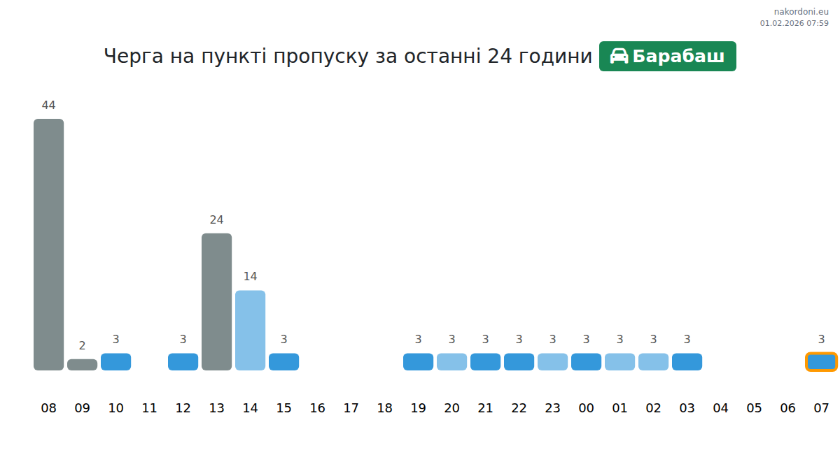 Для уникнення довгих черг на кордоні на пункті пропуску Барабаш - легковий автомобіль, рекомендуємо планувати перетин кордону в години найменшого навантаження. Згідно з даними за минулу добу, найменша кількість автомобілів спостерігалася між :00 та 3:00 годинами. Це ідеальний час для перетину кордону, щоб зекономити час і уникнути затримок.