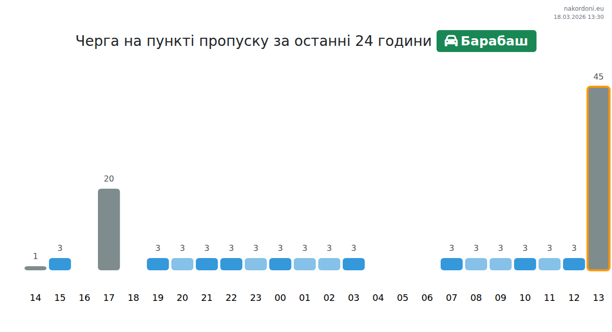Очікування на пункті Барабаш становить від 15 до 285 хвилин. Найбільші черги очікуються о 08:00, 12:00 та 16:00, тому краще планувати поїздку на 11:00, 14:00 або 15:00 для швидкого перетину.