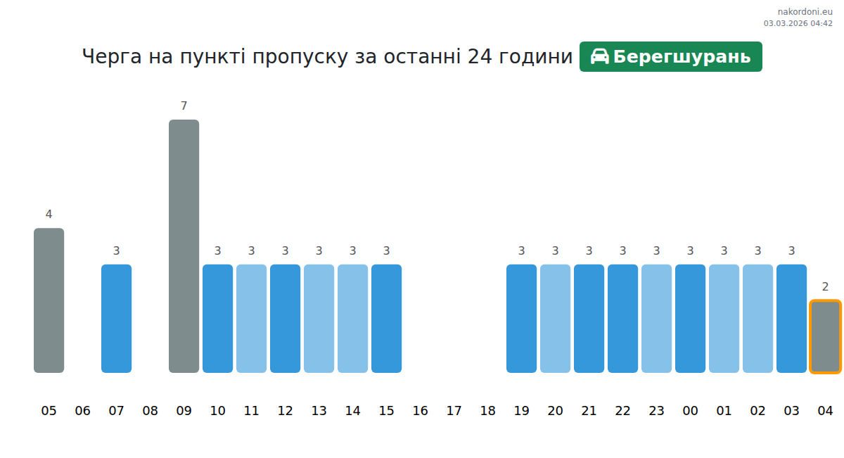 На пункті пропуску Берегшурань очікування для легкових автомобілів становить 15-93 хвилини. Пікові години, яких слід уникати: 08:00, 03:00 та 20:00. Найкоротші черги очікуються з 00:00 до 02:00.