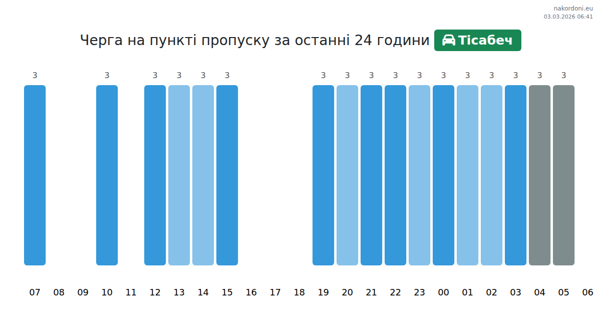 На КПП Тісабеч очікуваний час очікування становить від 15 до 135 хвилин. Уникайте перетину під час пікових годин: 09:00, 12:00 та 14:00. Найкращий час для швидкого перетину – 23:00, 00:00 та 01:00.