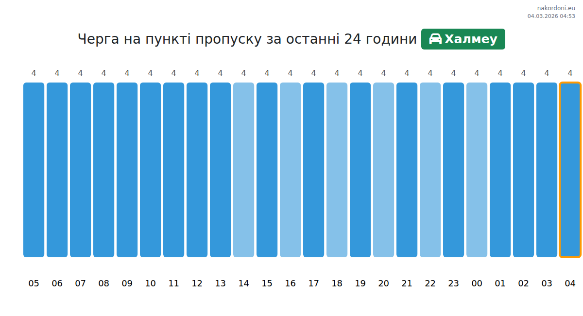 На Халмеу очікуйте час очікування для легкових автомобілів від 15 до 495 хвилин. Уникайте годин пік: 22:00, 09:00, 17:00. Найкращий час для перетину: 23:00, 00:00 та 01:00.