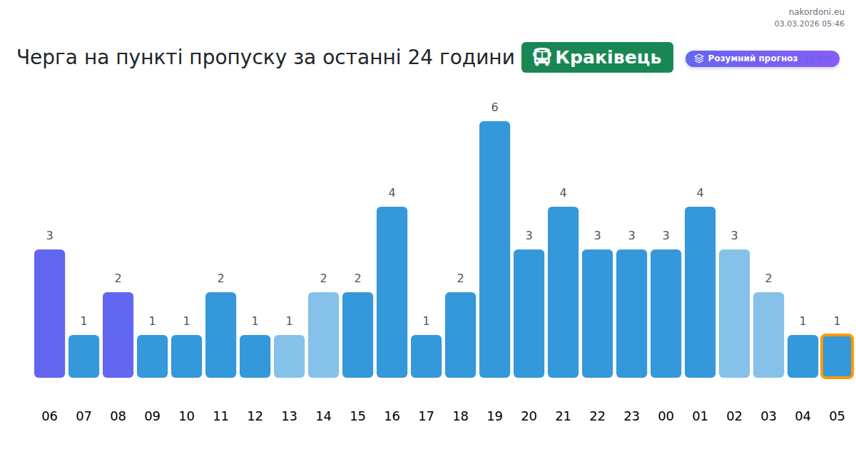 Для уникнення довгих черг на кордоні на пункті пропуску Краківець - автобус, рекомендуємо планувати перетин кордону в години найменшого навантаження. Згідно з даними за минулу добу, найменша кількість автомобілів спостерігалася між 4:00 та 5:00 годинами. Це ідеальний час для перетину кордону, щоб зекономити час і уникнути затримок.