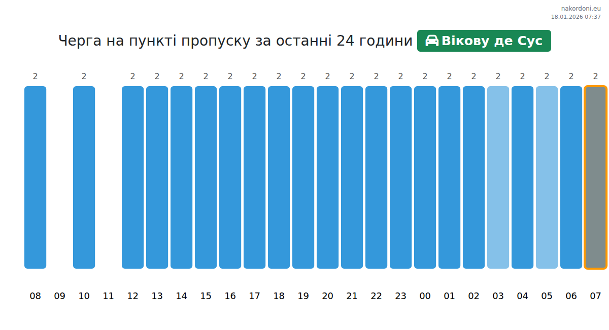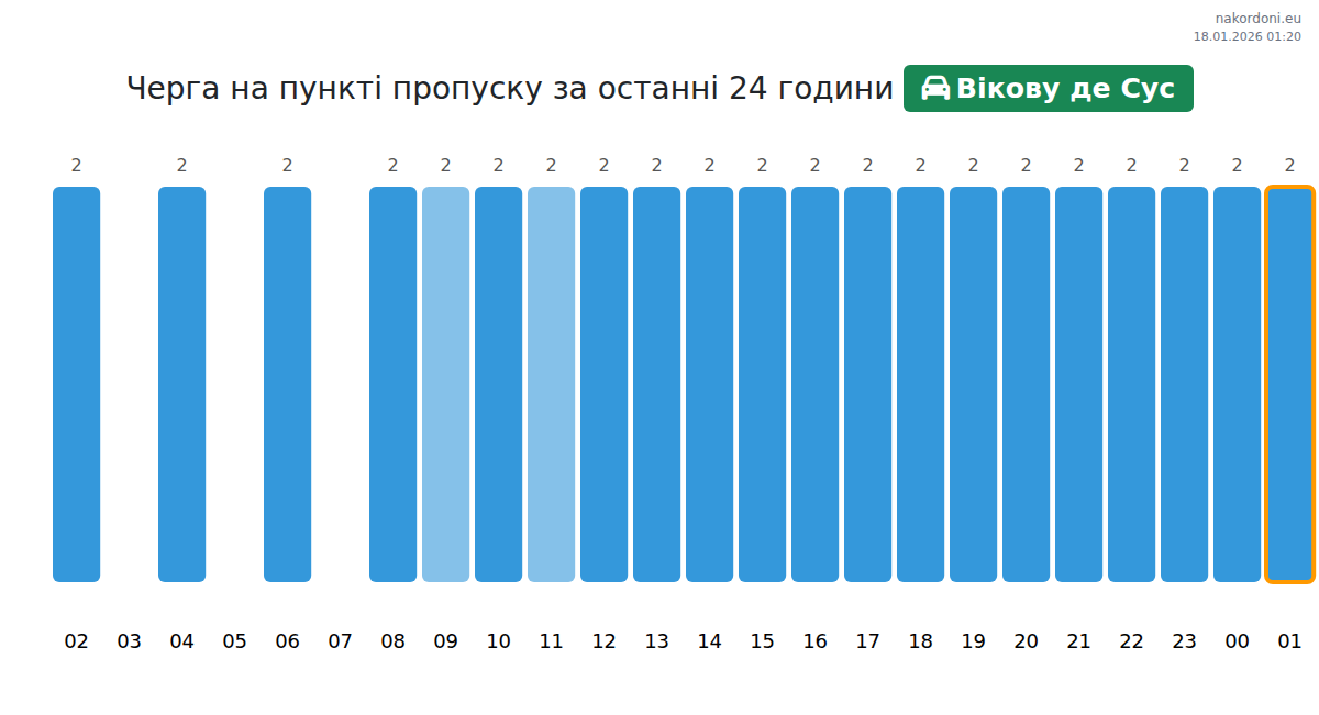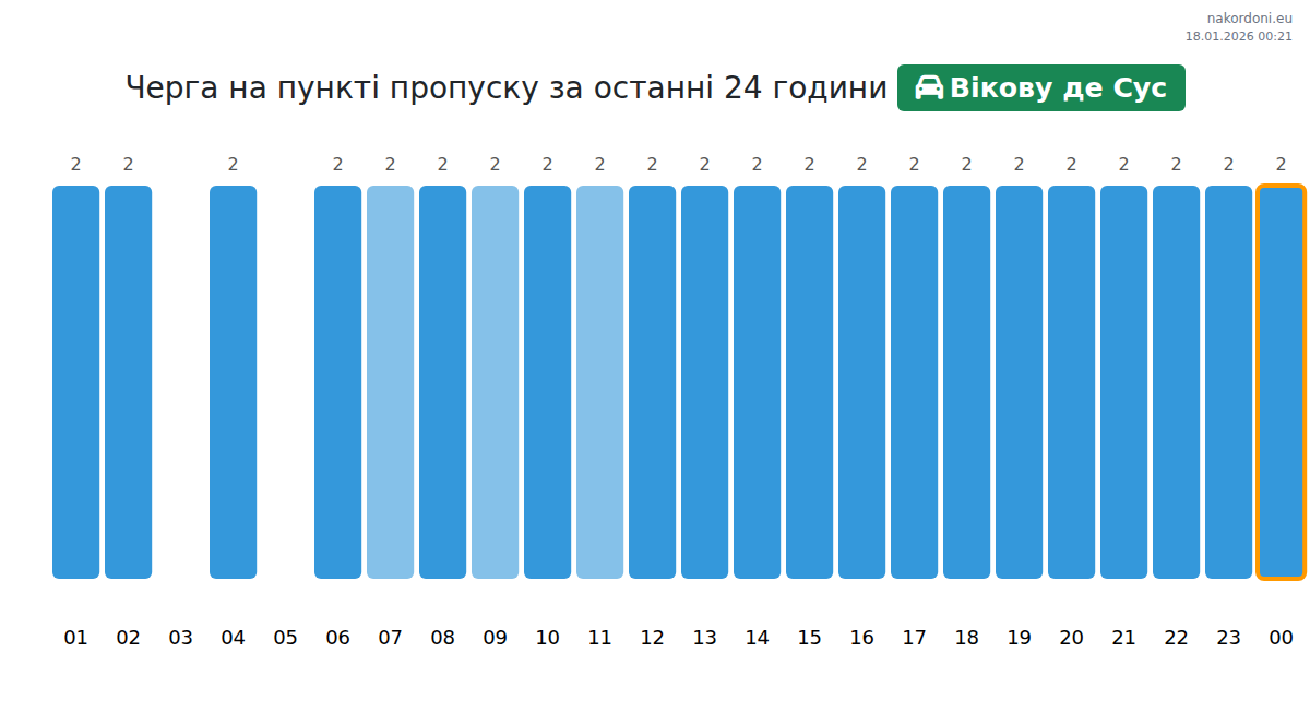 На пункті пропуску Вікову де Сус час очікування для легкових авто становить 15-21 хв. Найбільші черги очікуються о 22:00, 02:00 та 07:00, а найшвидше можна перетнути кордон о 23:00, 00:00 або 01:00.