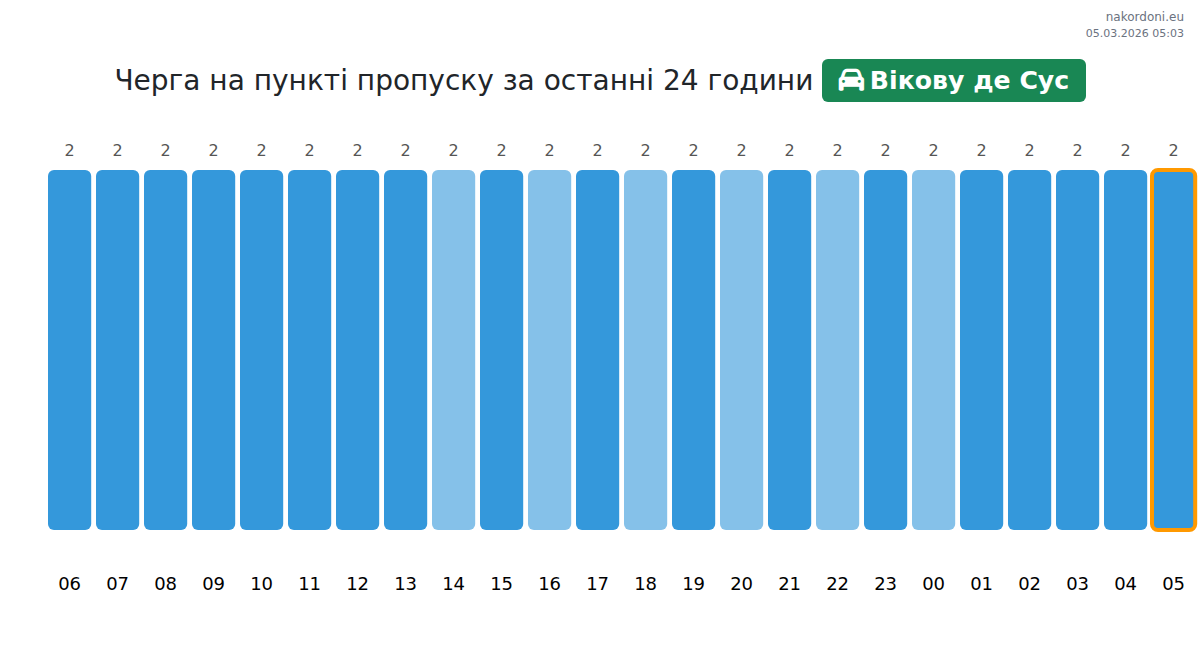 Для уникнення довгих черг на кордоні на пункті пропуску Вікову де Сус - легковий автомобіль, рекомендуємо планувати перетин кордону в години найменшого навантаження. Згідно з даними за минулу добу, найменша кількість автомобілів спостерігалася між 2:00 та 3:00 годинами. Це ідеальний час для перетину кордону, щоб зекономити час і уникнути затримок.