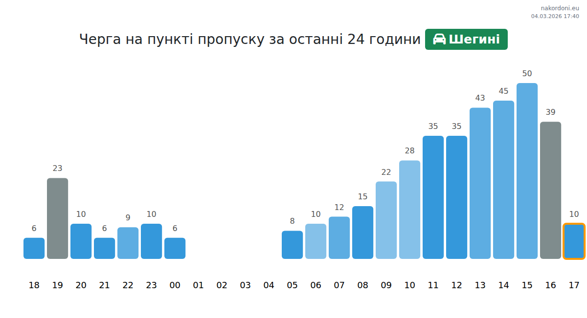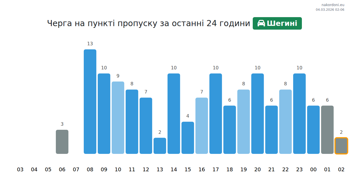 Для уникнення довгих черг на кордоні на пункті пропуску Шегині - легковий автомобіль, рекомендуємо планувати перетин кордону в години найменшого навантаження. Згідно з даними за минулу добу, найменша кількість автомобілів спостерігалася між :00 та 4:00 годинами. Це ідеальний час для перетину кордону, щоб зекономити час і уникнути затримок.
