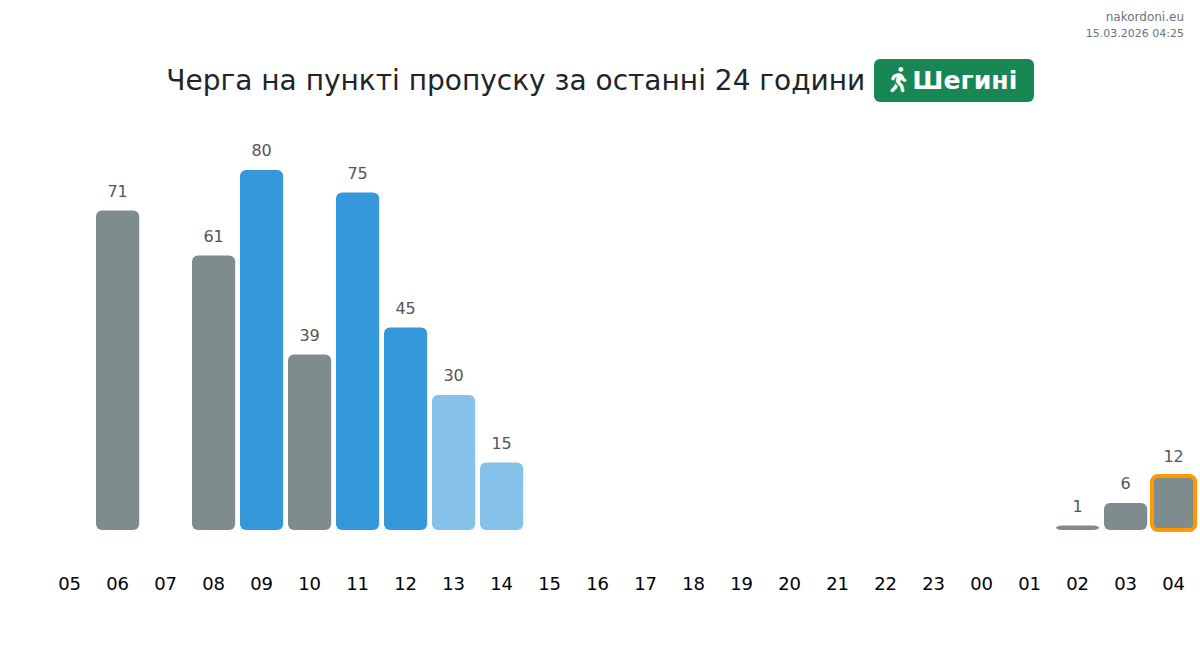 Для уникнення довгих черг на кордоні на пункті пропуску Шегині - пішохід, рекомендуємо планувати перетин кордону в години найменшого навантаження. Згідно з даними за минулу добу, найменша кількість автомобілів спостерігалася між :00 та 5:00 годинами. Це ідеальний час для перетину кордону, щоб зекономити час і уникнути затримок.