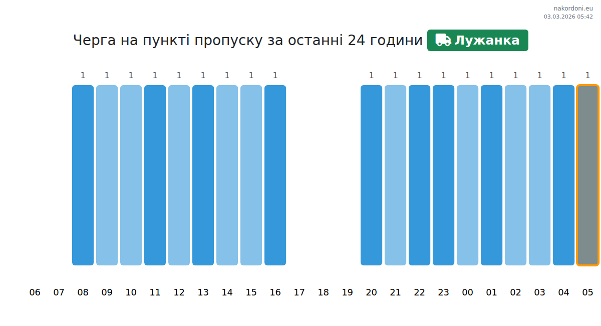 Для уникнення довгих черг на кордоні на пункті пропуску Лужанка - вантажний транспорт, рекомендуємо планувати перетин кордону в години найменшого навантаження. Згідно з даними за минулу добу, найменша кількість автомобілів спостерігалася між 1:00 та 4:00 годинами. Це ідеальний час для перетину кордону, щоб зекономити час і уникнути затримок.