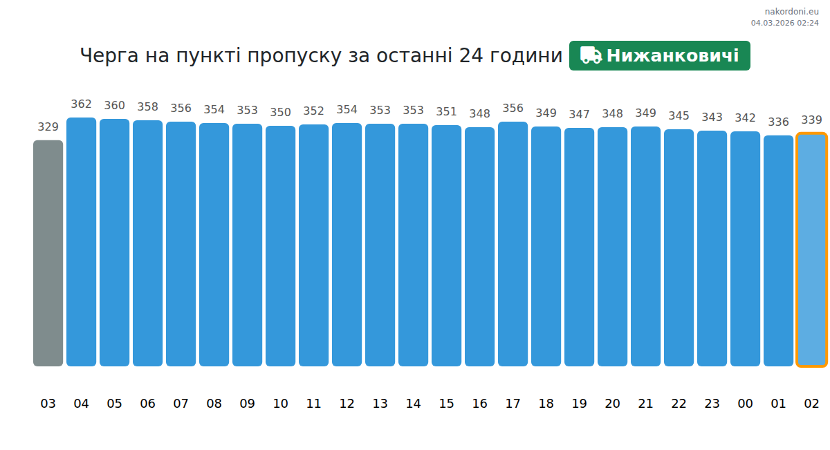На пункті пропуску Нижанковичі час очікування для транспортних засобів прогнозується від 15 до 3395 хвилин. Рекомендується уникати пікових годин о 04:00, 00:00 та 01:00. Для менших черг найкращий час для перетину – 02:00, 03:00 або 21:00.