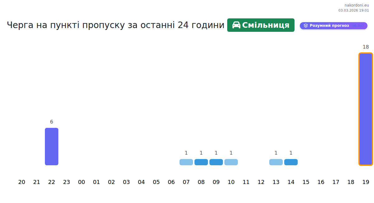 На КПП Смільниця очікуйте час очікування від 15 до 219 хвилин. Уникайте годин пік о 08:00, 17:00 та 11:00. Найкоротші черги прогнозуються на 15:00, 18:00 та 21:00.