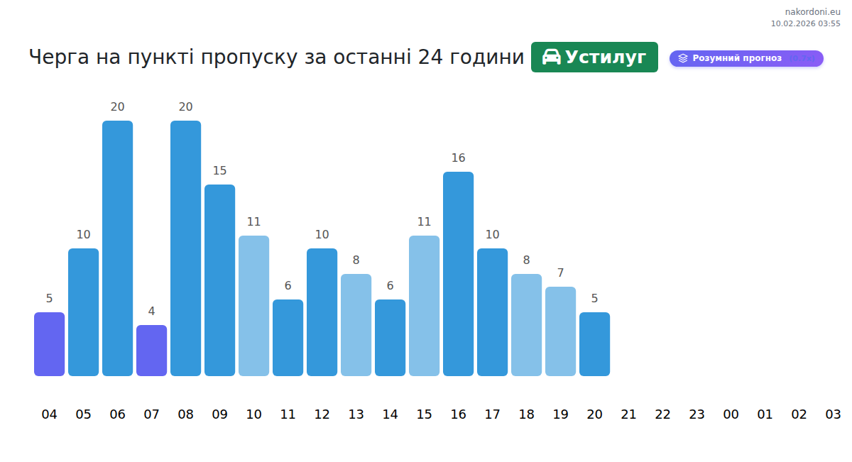 На пункті пропуску Устилуг час очікування для легкових автомобілів прогнозується 31-91 хвилина. Уникайте годин пік: 20:00, 21:00, 17:00. Найкращий час для перетину кордону: 23:00, 03:00, 05:00.